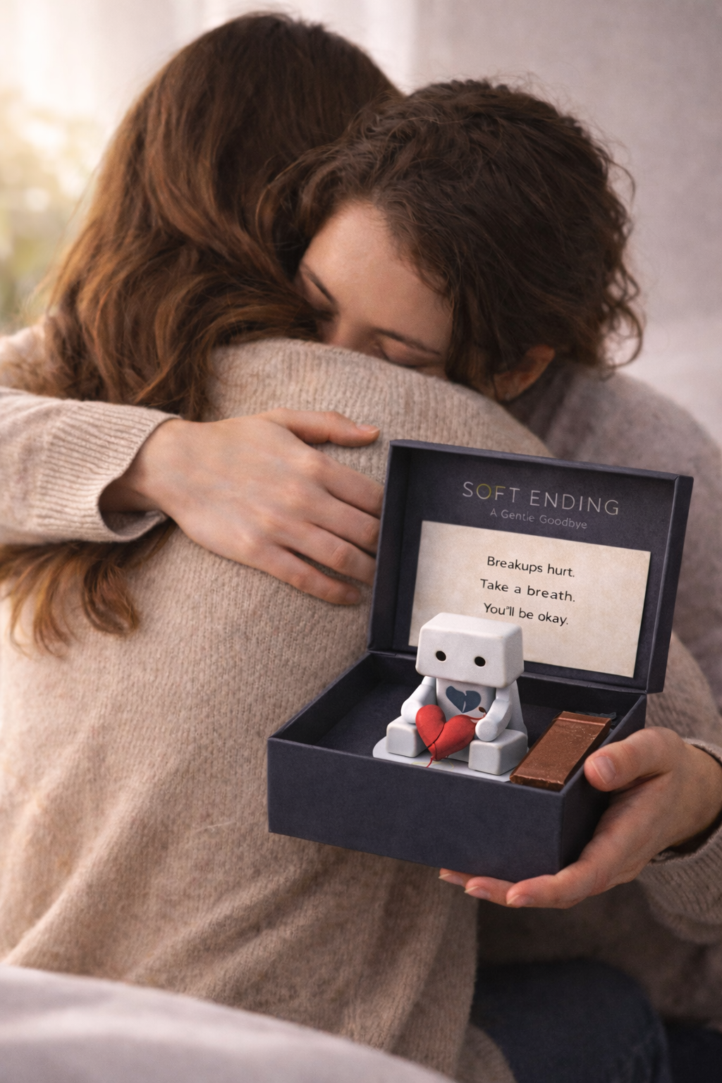 We created the Soft Ending box as a thoughtful way to send comfort, kindness, and closure during difficult moments. Each box includes a small figurine holding a broken heart, a comforting message, and a simple treat — a symbolic reminder that endings can also be new beginnings.